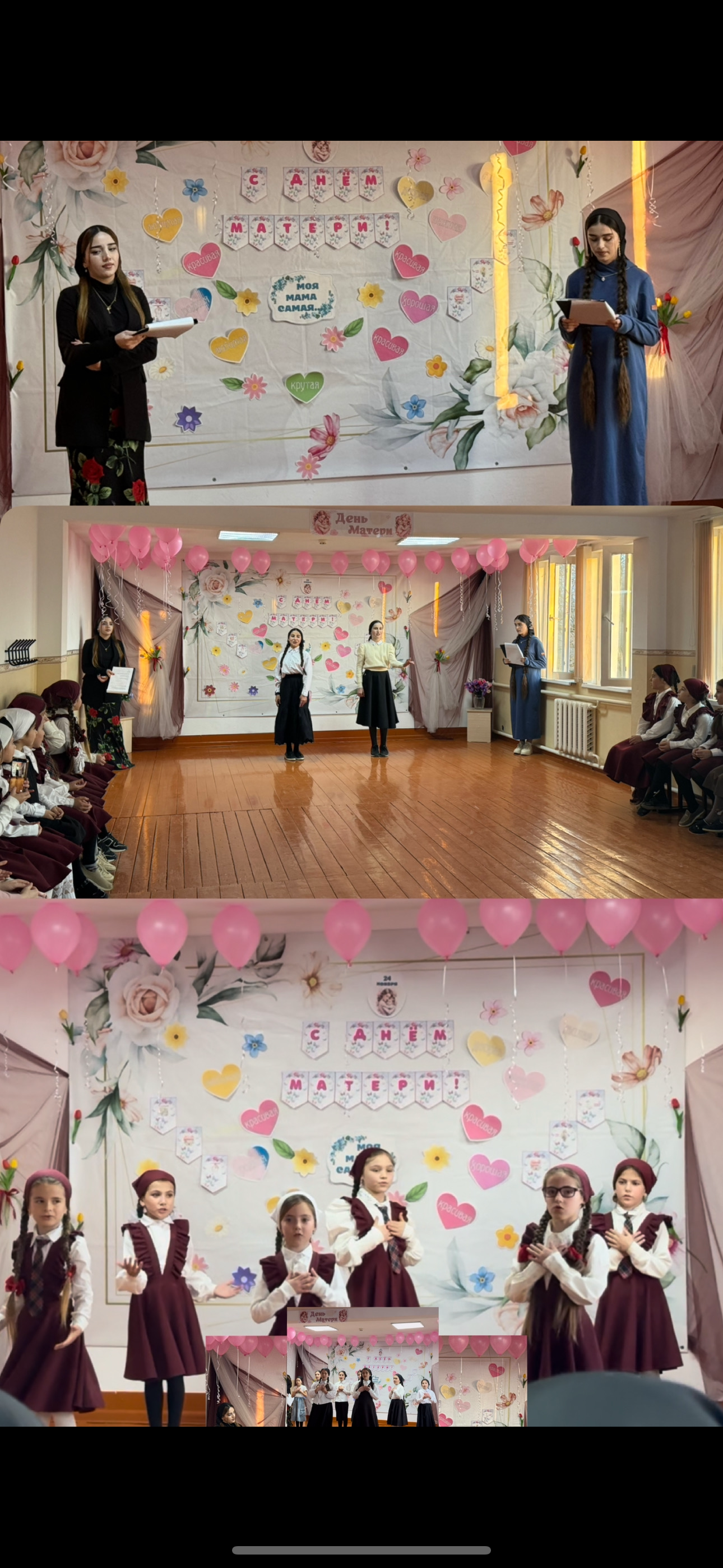 28 ноября в школе состоялся праздничное мероприятие для мам: «Пусть мама услышит». В школе царила необычайно добрая, праздничная атмосфера.Каждый класс подготовил свой праздничный номер. Один за другим на школьную сцену выходили юные таланты. Участники концерта читали стихи, пели песни, танцевали, разыгрывали сценки, и все это посвящалось любимым мамам.